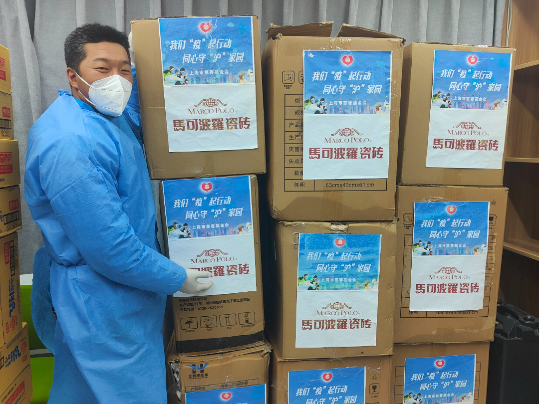 上海奥博贸易有限公司(马可波罗磁砖)捐赠300套防护服、300片隔离面罩、300副鞋套,为社区防疫工作添砖加瓦。