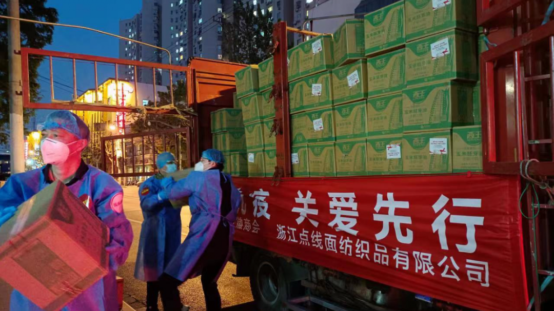 浙江点线面纺织品有限公司在绍兴市柯桥区工商联、中国轻纺城安徽商会的共同协助下,快速协调车辆和物流公司,捐赠4000袋大米、4000瓶食用油,为封控中的社区困难居民送来温暖。