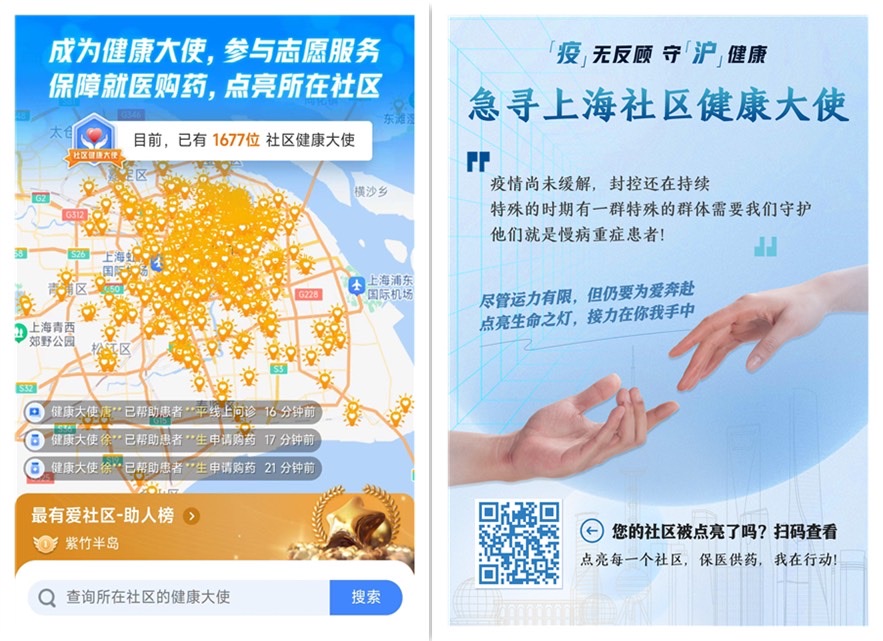 不只是孙奶奶,福寿康的护理人员所服务的众多上海失能老年人,都面临着就医用药难题。为快速打通疫情之下百姓看病就医的堵点、难点,上海市数字医学创新中心联合微医、瑞金医院等医疗机构、医药企业首先发起了“上海就医保药应急平台”,为在沪的慢病患者提供医疗、医药保障服务。为提升终端服务能力,应急平台招募“社区健康大使”,为居民提供在线问诊通道、紧急用药调度,并直接对接药品保供,形成服务闭环。