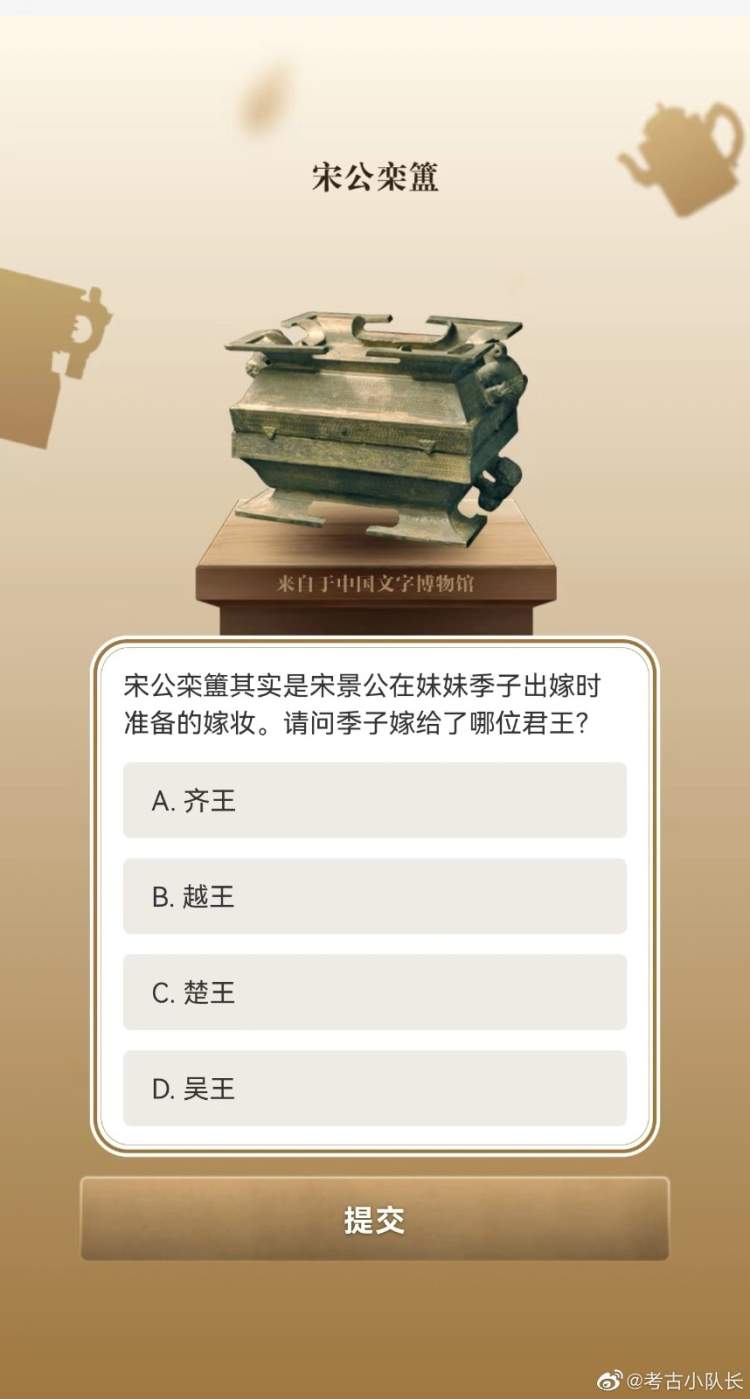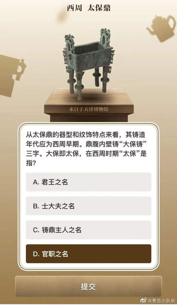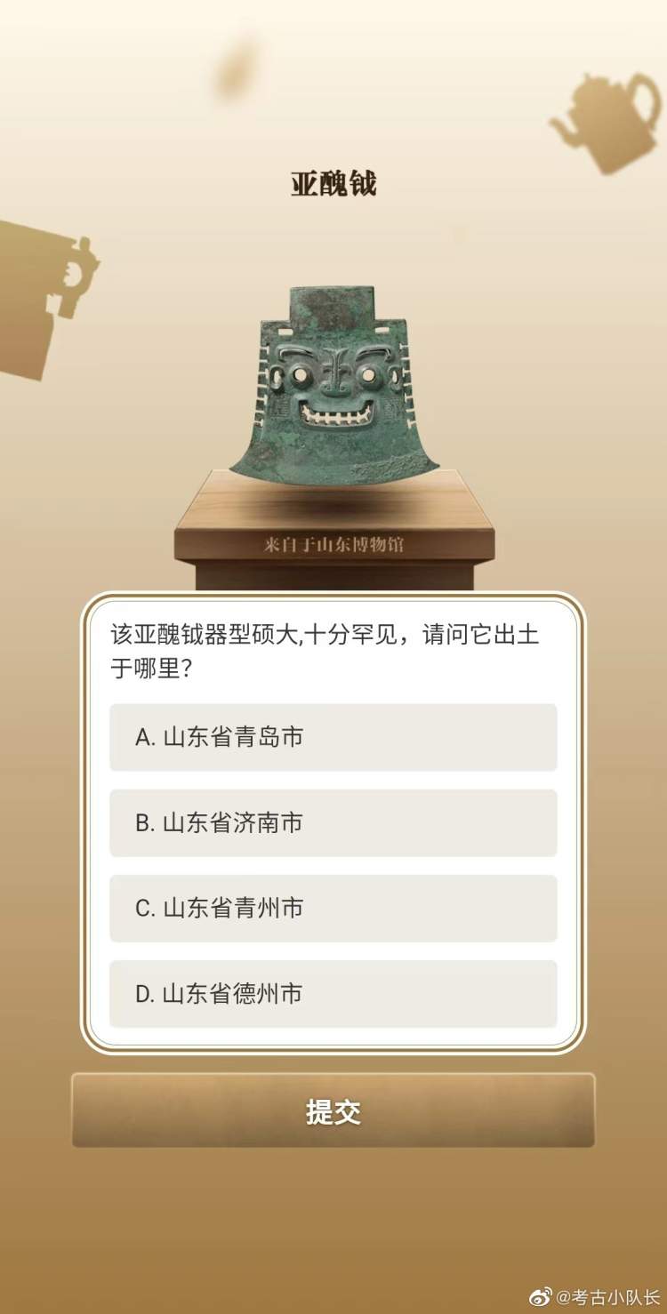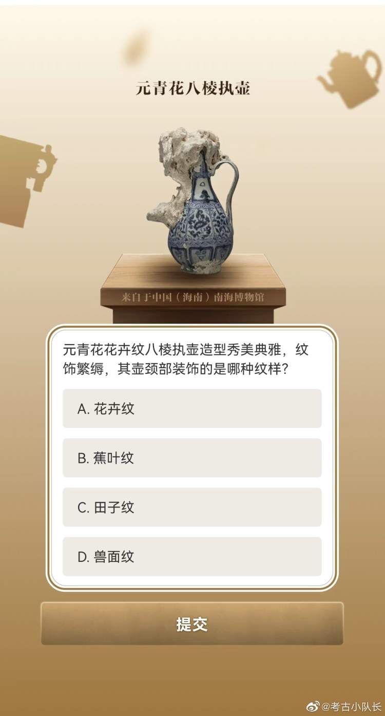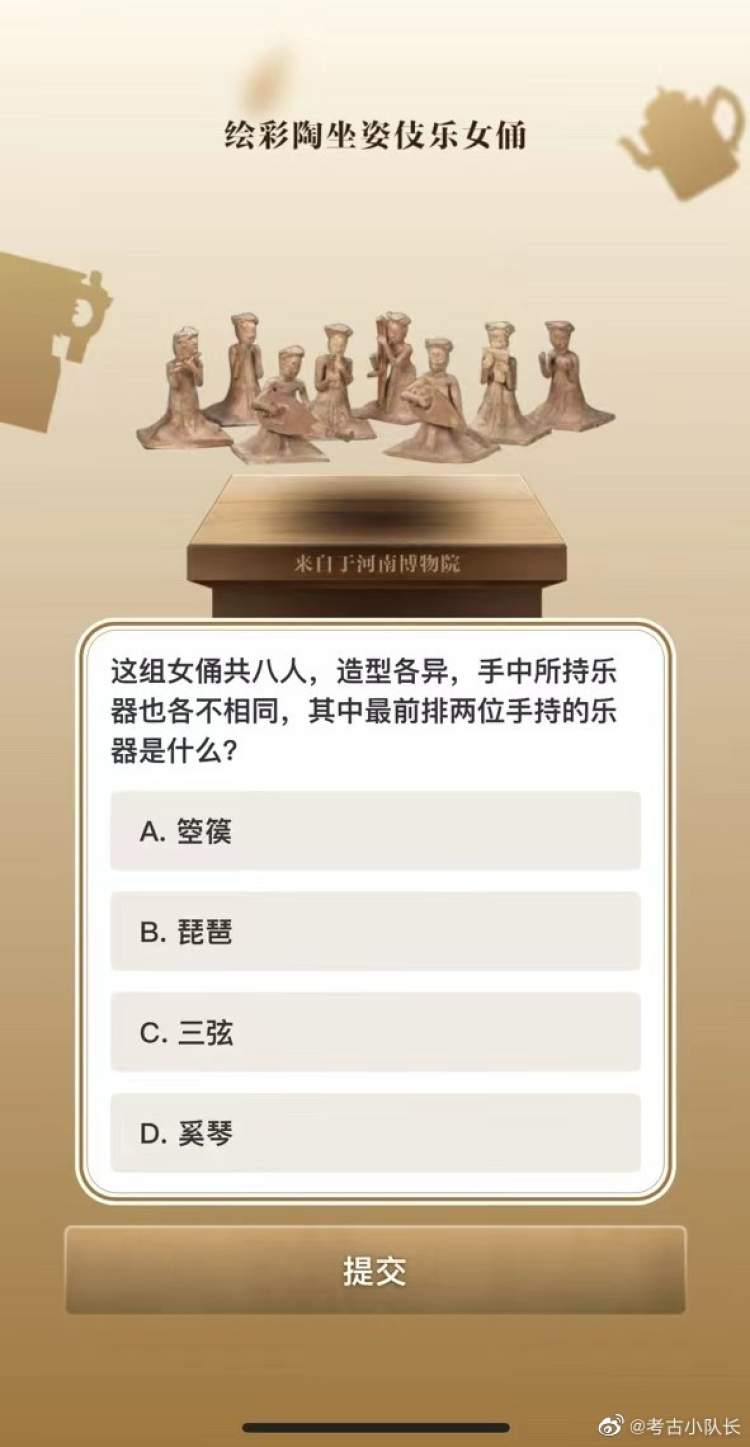 学霸们今天也没闲着,5·18弄出个“博物馆知识全国试卷”,专门考你文物知识。比如彩绘陶坐姿伎乐女俑坐在前排的女俑手持的是什么乐器?元青花八棱执壶上面是什么纹饰?西周太保鼎的那个“太保”究竟是什么职务?