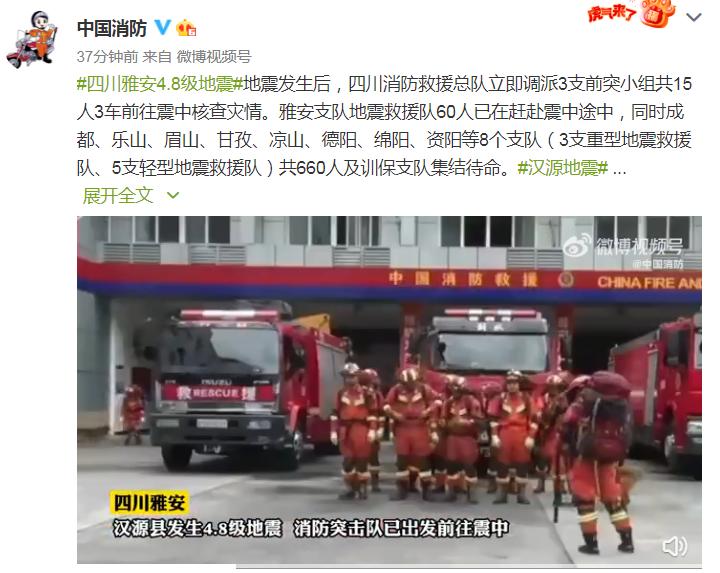地震发生后,四川消防救援总队立即调派3支前突小组共15人3车前往震中核查灾情。雅安支队地震救援队60人已在赶赴震中途中,同时成都、乐山、眉山、甘孜、凉山、德阳、绵阳、资阳等8个支队(3支重型地震救援队、5支轻型地震救援队)共660人及训保支队集结待命。