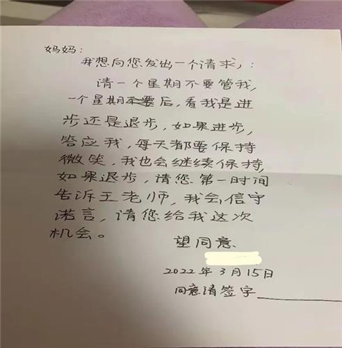 在王艳老师耐心的安抚下,家长情绪平复了许多,并表示会与孩子好好沟通,了解孩子内心真实的想法。后来,母女俩还签署“亲子协定”,确定了彼此的承诺,增进理解。没过多久,王老师收到了家长的反馈:“和孩子聊后,我知道了她很多心里的想法,我会给她一些空间,提高自制力,谢谢王老师!”