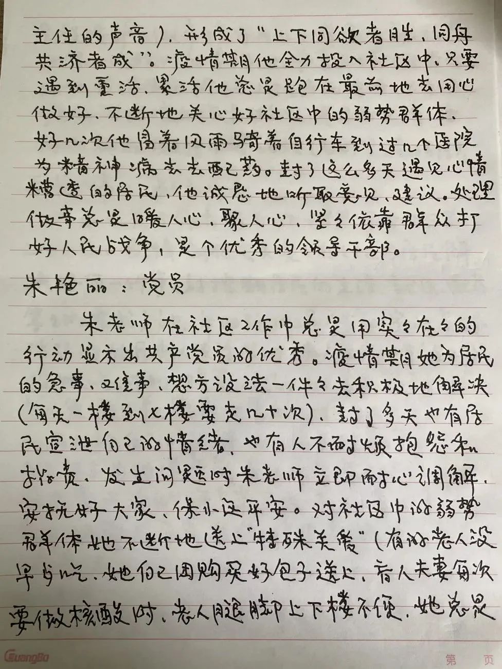 在居民眼中,华五居民区党总支书记朱颖就是整个辖区的“领头羊”,疫情开始,她就住在了居委会,全身心扑在了社区工作中,她在居民区里落实“楼组党建”“健康守护”“特殊关爱”三大行动,取得积极效果。为全力打赢这场保卫战,朱颖有时候累得晚上趴在桌上就睡着了,大家见了真是又心疼又感动。