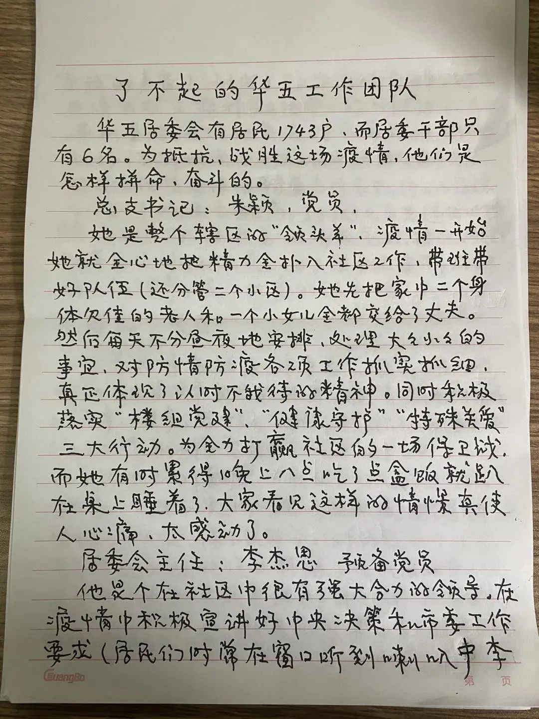 第一封感谢信《了不起的华五工作团队》是华阳路街道老年协会华五分会写来的,长达五页的手写长信,细细记录了华五居民区的6名居委会干部们战胜疫情的努力和奋斗。