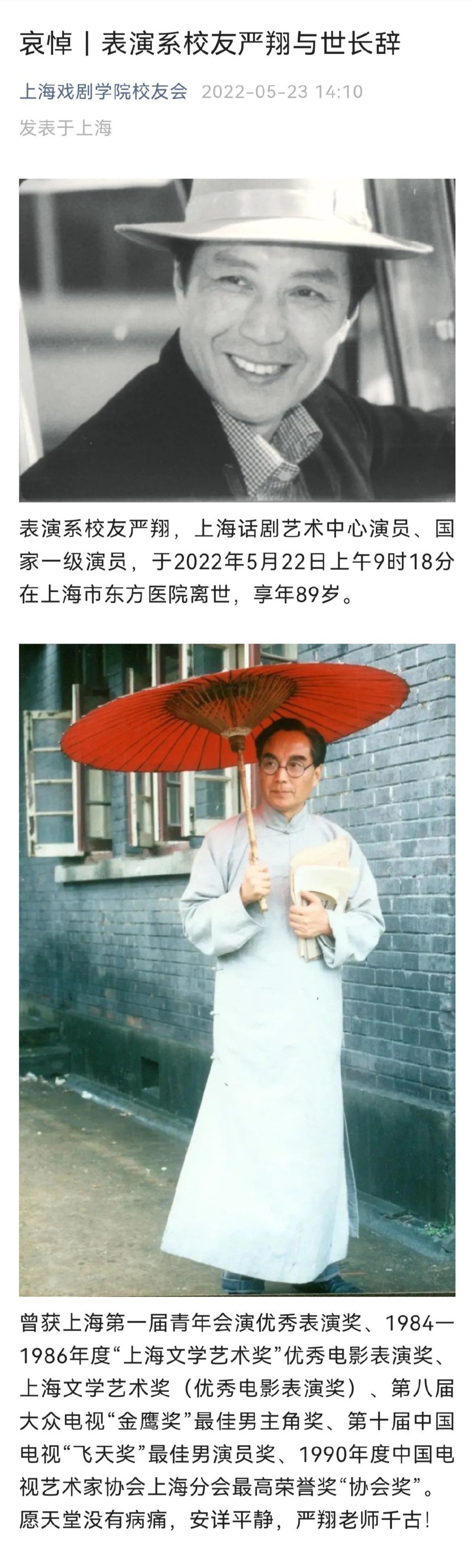 表演系校友严翔,上海话剧艺术中心演员、国家一级演员,于2022年5月22日上午9时18分在上海市东方医院离世,享年89岁。