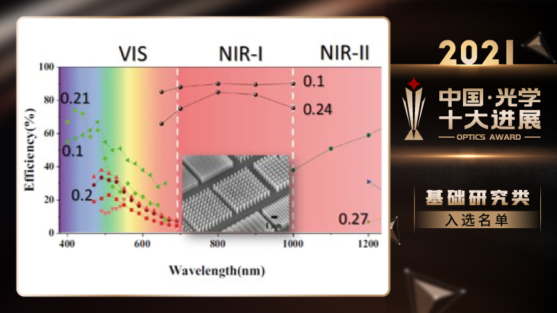 “超构表面"作为一种超薄的微纳结构,为解决设备小型化、集成化的需求提供了一个很好的平台。哈尔滨工业大学(深圳)肖淑敏微纳光子学实验室借助由C4对称的基本单元构成的二氧化钛超构表面并凭借先进的微纳加工手段,设计并制备出了工作于近红外成像窗口的高效率宽带消色差超构透镜。首次将二氧化钛微纳制备的深宽比提高到37.5,是先前记录的2.5倍。实验结果表明该消色差超构透镜在650-1000nm波段范围内实现消色差成像,平均聚焦效率破纪录地高达88.5%。同时,通过生物成像实验进行对比,消色差超构透镜成像质量媲美商用物镜,在分辨率方面要优于商用物镜。该工作对于生物医疗,集成光学以及微纳制备的发展具有重要意义。