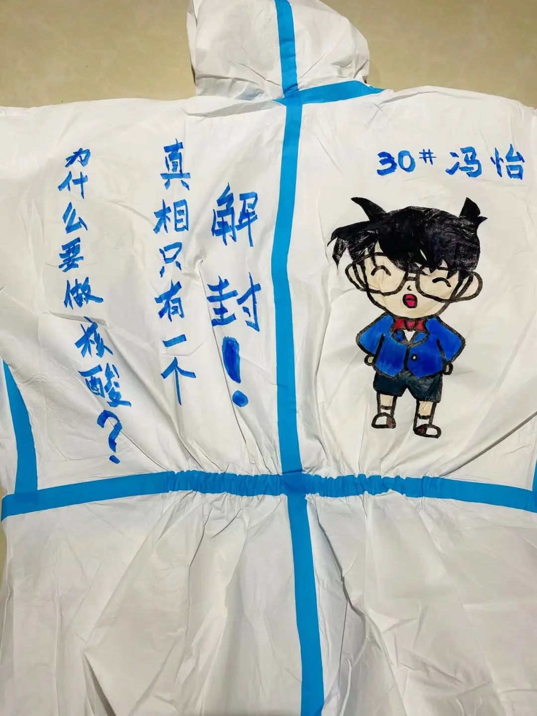 一件件专属定制的防护服,给防控疫情工作“加点儿料”,也让宅家日久的居民“有点儿暖”。被问及创作的初衷,冯怡说道,“随着封控时间的日益延长,居民难免有些负面情绪,所以我想用防护服上可爱的卡通图案和积极向上的文字让人眼前一亮,让看到这些的居民心情能够放松。”