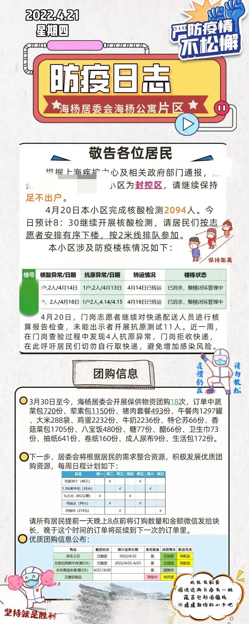 4月17日,小区发布了第一次纯文字版防疫信息。考虑到看文字可能吸引力不够,于是,4月18日,金懿又以海报图片的形式将重要信息进行了标注发布。“这样关注度和吸引力就会相对大一些,宣传效果也会更好。”同时,志愿者们还同步制作推送了志愿者防疫日志,从居委会和志愿者两个角度帮助居民了解小区的疫情动态、当天的核酸或抗原自测安排、防疫知识、志愿者的心里话等等。每天一早,先查阅海杨居委会的防疫日志,已渐渐成为居民们的习惯。