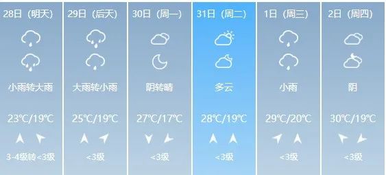 预计28日午后开始逐渐转雨,30日下午雨渐止转阴到多云,明显降水时段出现在29日凌晨到白天,并伴有雷电和短时强降水等对流天气,小时最大雨强20-40毫米,过程累积雨量30-50毫米,局部地区可达60-80毫米。