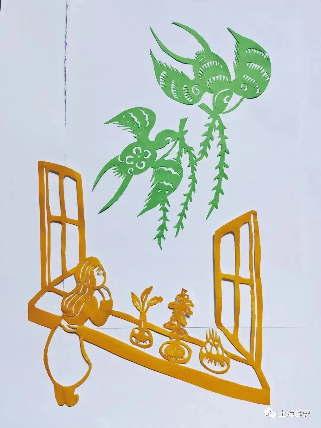 林玲在朋友圈看到自己参加的古筝班张老师虽然封控在家,却在窗台上用蔬菜根茎种出了一片新绿,她也由此剪了一幅精彩的作品。