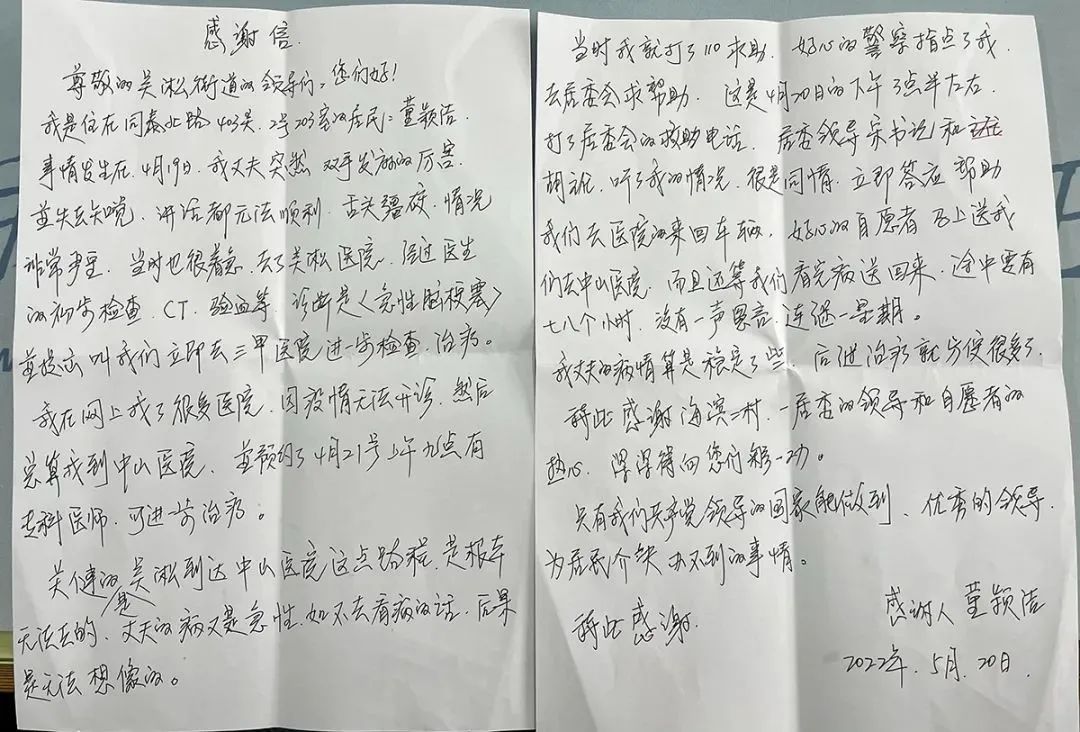 日前,一封感谢信被送到了宝山区吴淞街道办事处。感谢信从居民爱人突发脑梗不适说起,描述了居委、志愿者接力相助,车接车送就医,一周来毫无怨言的点点滴滴。