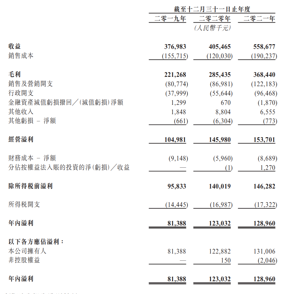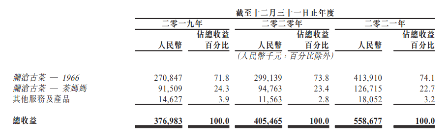 分业务来看,在2019年、2020年及2021年,来自1966产品的收益分别为2.71亿元、2.99亿元及4.14亿元,分别占同期总收益的71.8%、73.8%及74.1%;来自茶妈妈的收益则分别为0.92亿元、0.95亿元、1.27亿元,分别占同期总收益的24.3%、23.4%及22.7%。