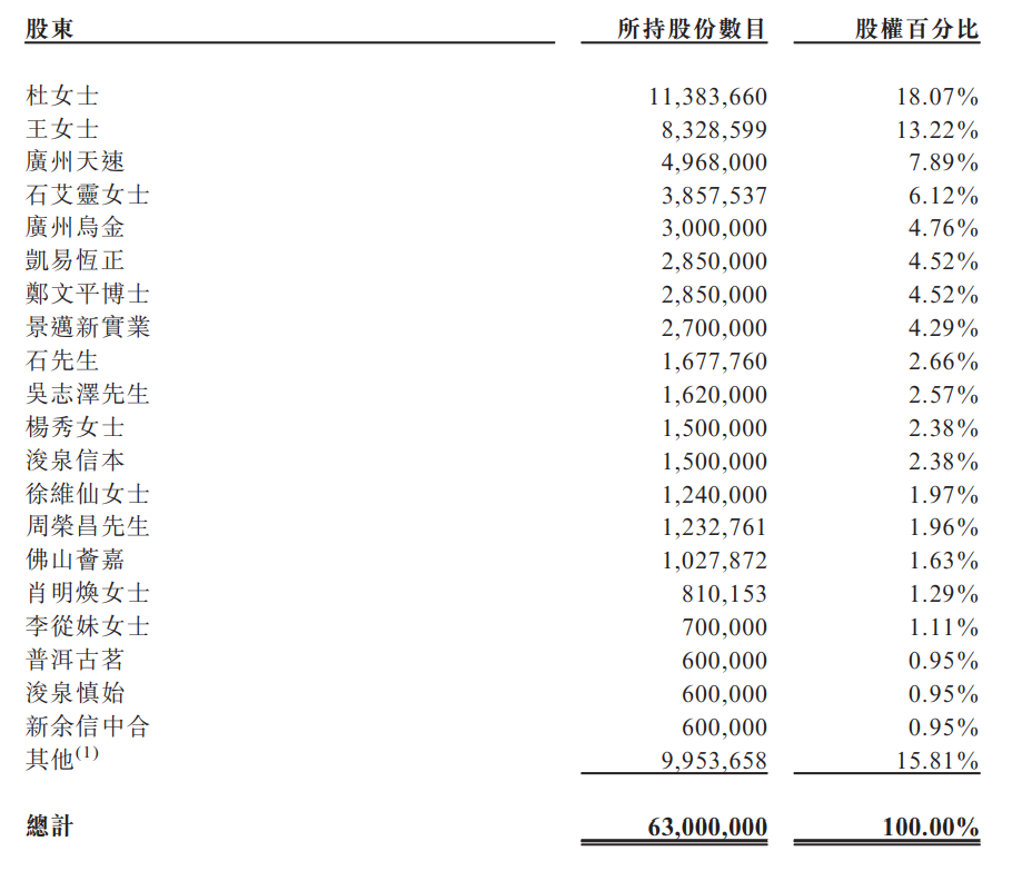 另据招股书,在2022年5月23日,董事会主席杜春峄和总经理王娟作为一致行动人,分别持有18.07%、13.22%股份,叠加杜春峄的丈夫石跃持有2.66%、杜春峄的女儿石艾灵持有6.12%股份,以及王娟控制的广州天速信息科技有限公司持有7.89%股份,共有47.96%的表决权,为澜沧古茶的控股股东。