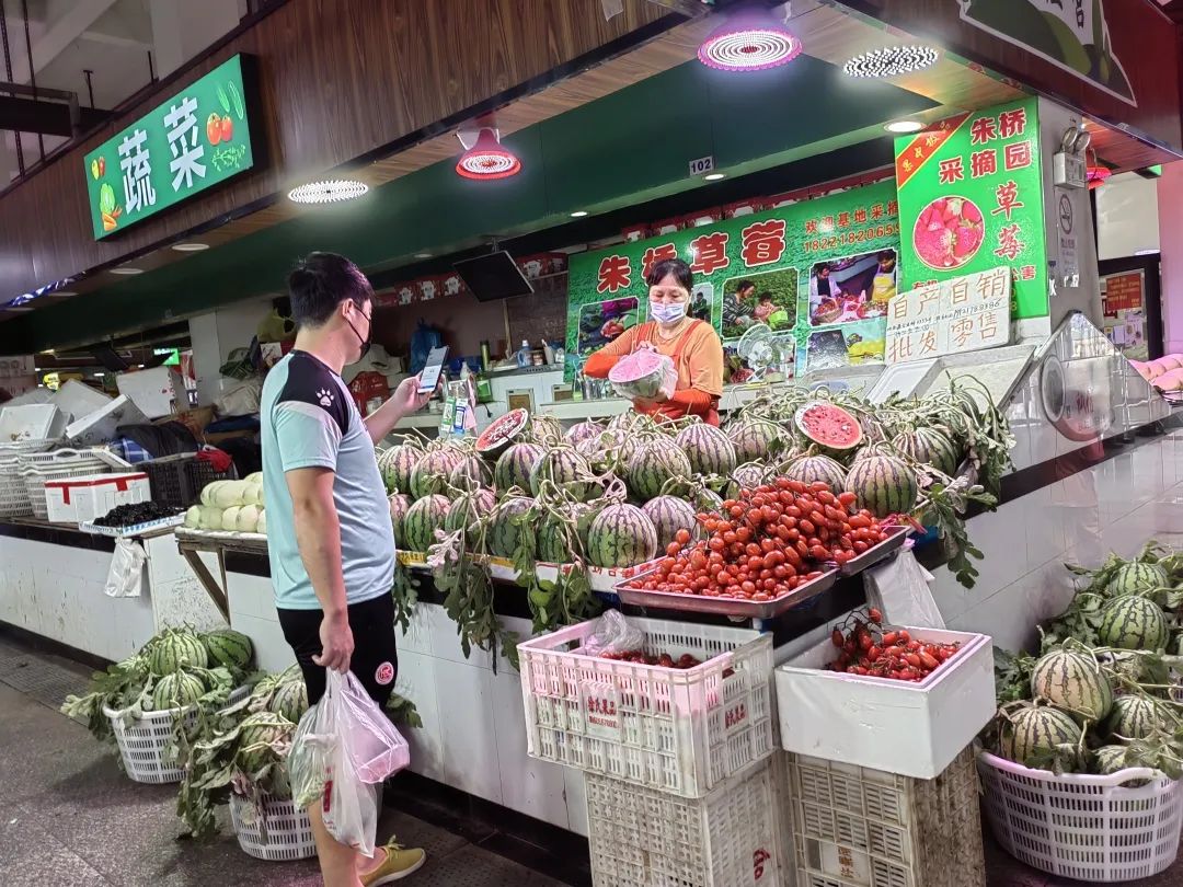 在菜场入口处的西瓜摊上,西瓜摆得满满当当,价格分为3.5元/斤和3.8元/斤两种。“上个月西瓜卖4.5元/斤,因为前段时间西瓜刚上市,品种少货源少,现在价格平稳回落,越往后面价格基本会越来越低,这与当季生鲜时令相关。”经营户韩金珍表示,“5月一天最多的时候大概卖到200斤。恢复常态后,前一天我就卖了800多斤西瓜,达到去年同期近60%的量。”