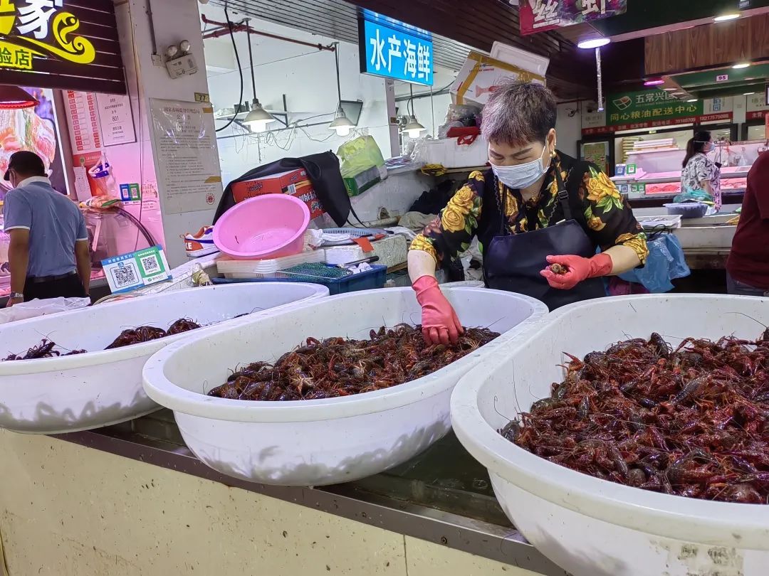 “因为供应多了,小龙虾现在便宜了不少。上个月的时候小龙虾价格要50多元一斤,现在卖30元。销量的话,环比上个月来说,每天也是增加了近三倍的售卖量。”经营户周女士说。
