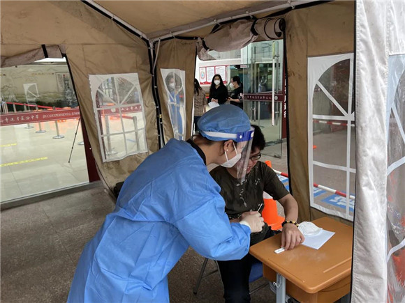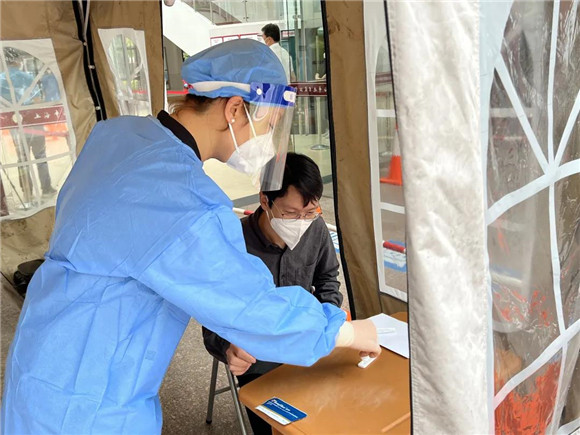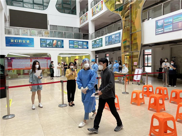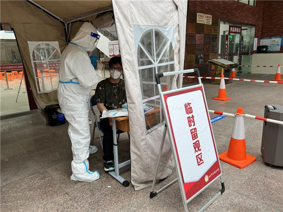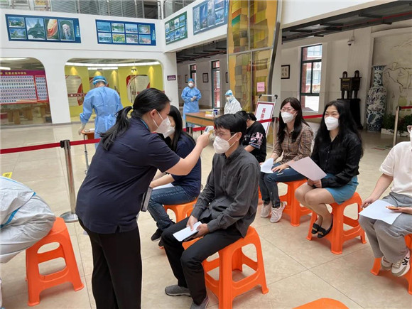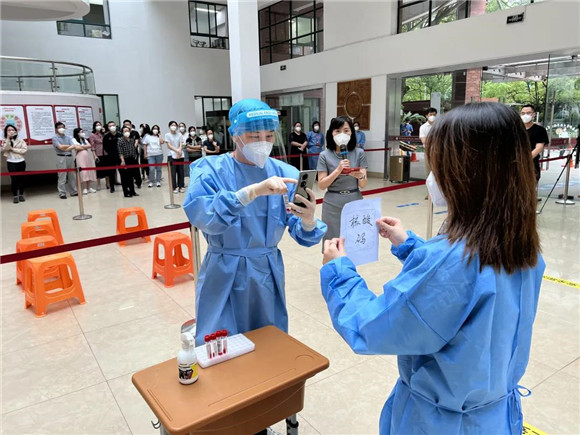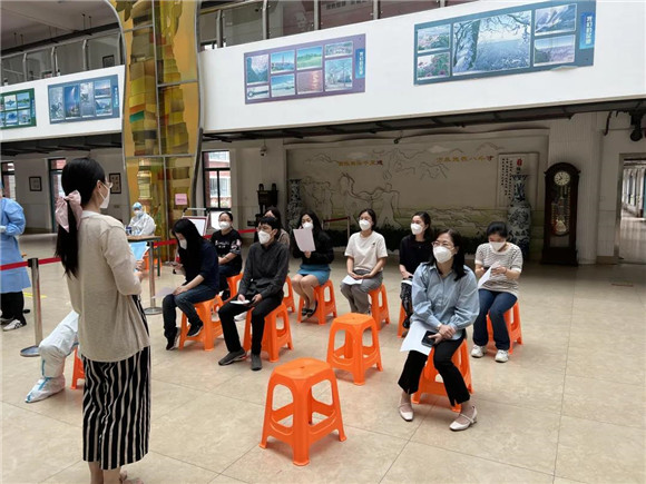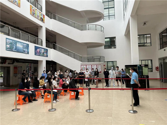 负责老师引导学生们在规定区域内有序排队、等候。师生们全程佩戴N95口罩,保持二米线距离,依次有序入场,迅速完成核酸采样。