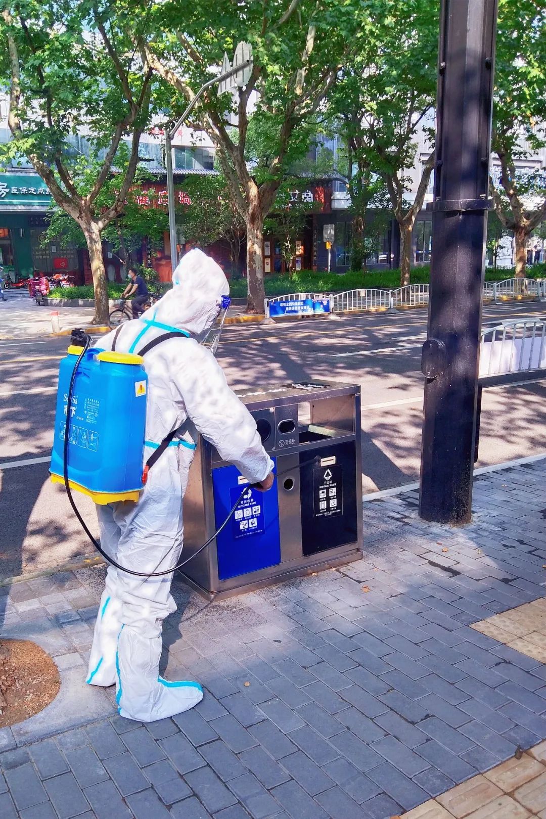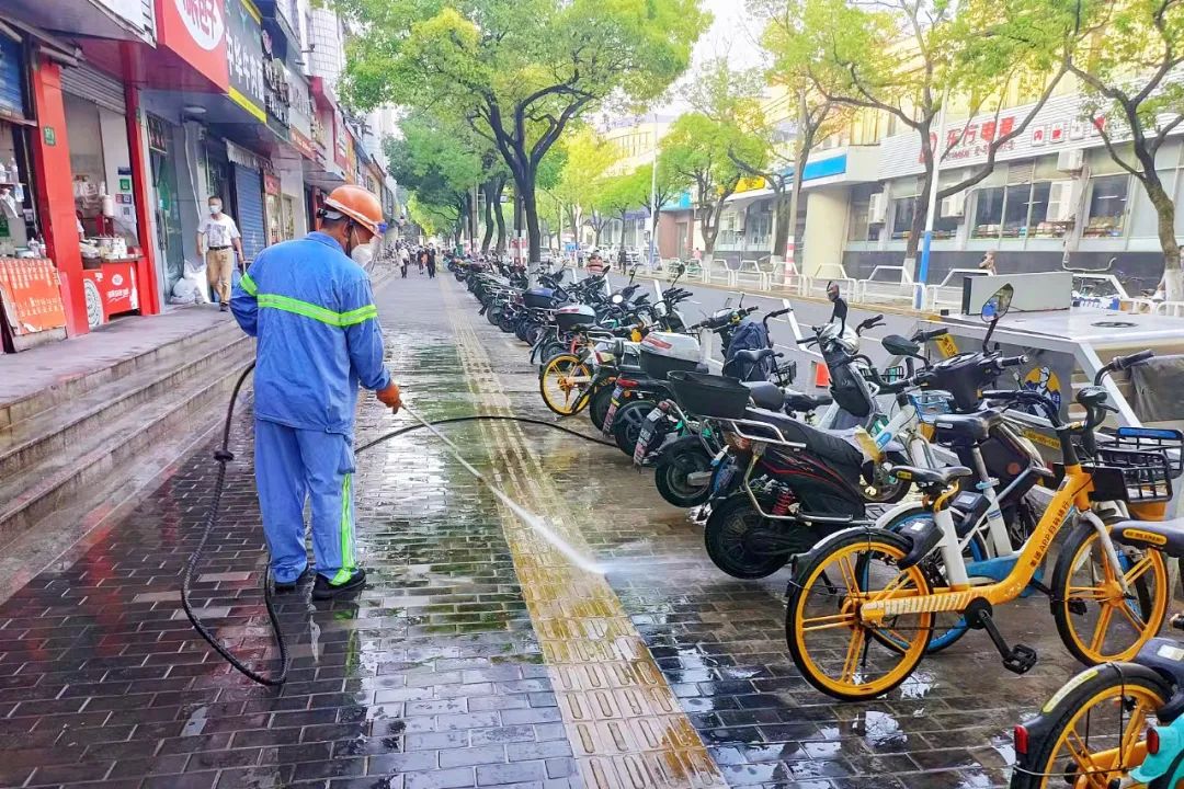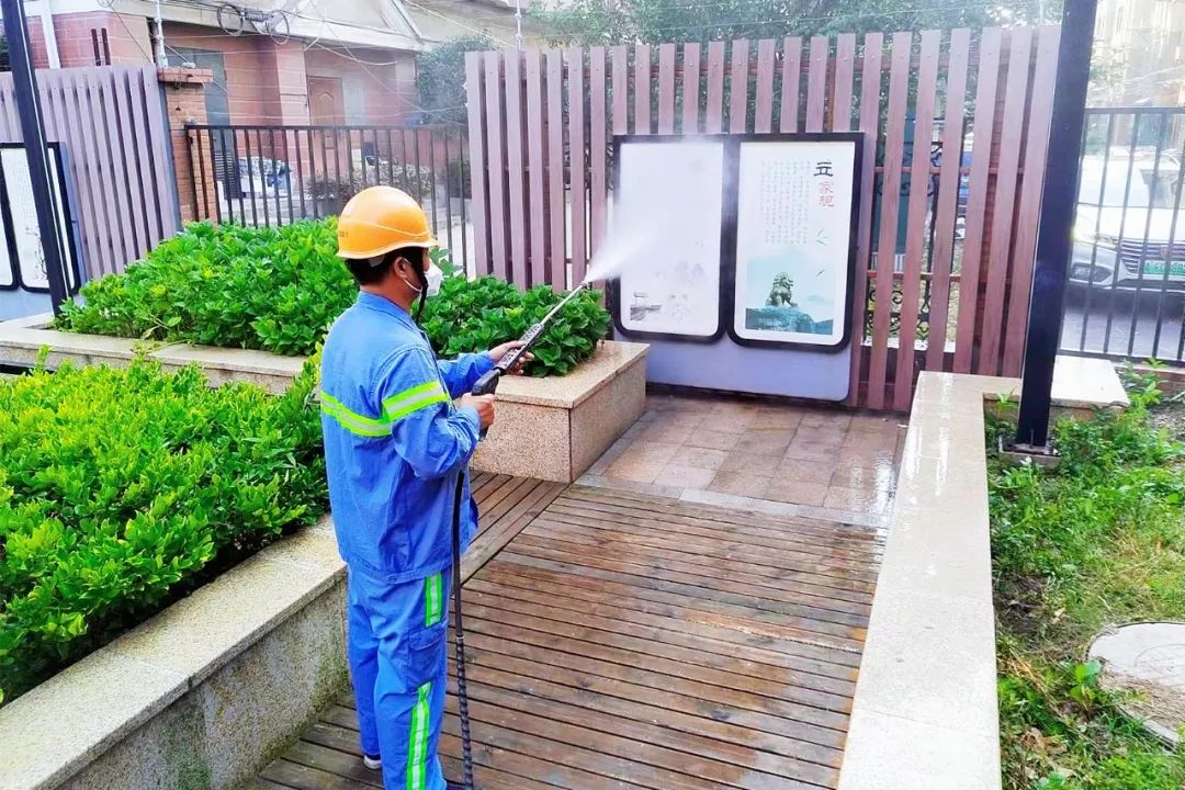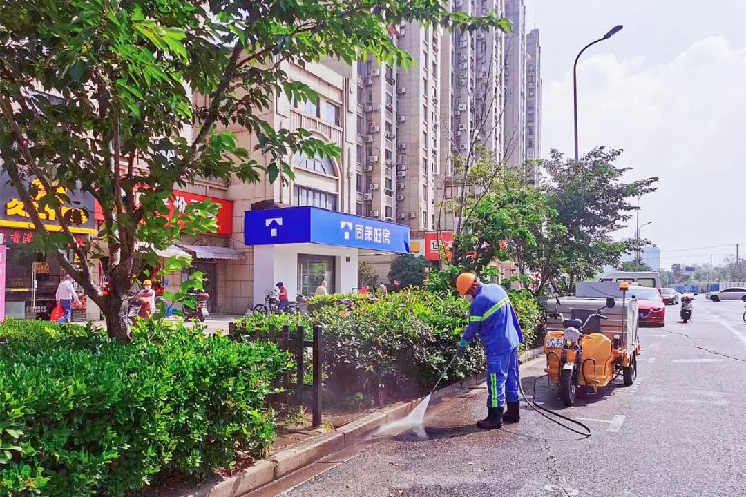 在前期“大冲洗”的基础上,东晨公司继续排查短板盲区,将常态化保洁与精细化保洁相结合,把冲洗保洁范围从主要道路往两侧延伸,重点加强商圈、沿街商铺、菜场周边等薄弱部位的冲洗整治。公司“保洁—市容”一体化作业力量迅速集结,在辖区内全面推进中小道路沿街、背街小巷、绿化隔离带、树穴墙角、快递柜周边等大扫除、大清理,及时清除积存垃圾;严格落实消杀规范和技术要求,持续加强对沿街废物箱、城市家具及公厕进行深度清洁消杀。