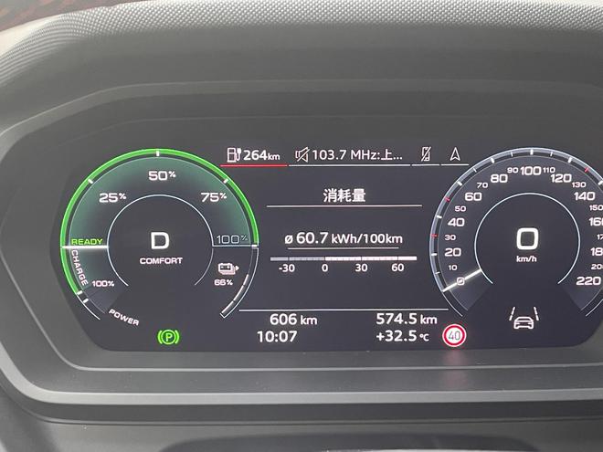 最后来看看试驾方面吧,本次从静安区奥迪创智汇出发,终点是松江的云间粮仓。全程45KM,出发前的续航为264km。