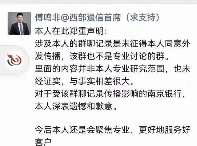 与此同时,傅鸣非在发朋友圈紧急致歉,声明称,相关群聊记录未征得本人同意外发传播,内容并非其专业研究范围,也未经证实,与事实相差很大。傅鸣非深表遗憾和歉意。