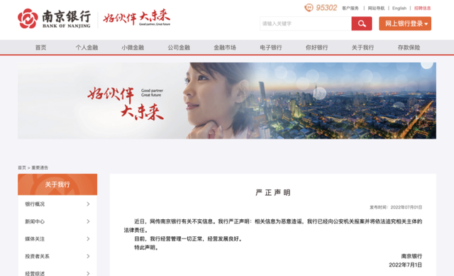 7月1日晚间,南京银行发布公告称已向公安机关报案。在公告中,南京银行称:“近日,网传南京银行有关不实信息。我行严正声明:相关信息为恶意造谣,我行已经向公安机关报案并将依法追究相关主体的法律责任。目前,我行经营管理一切正常,经营发展良好。”
