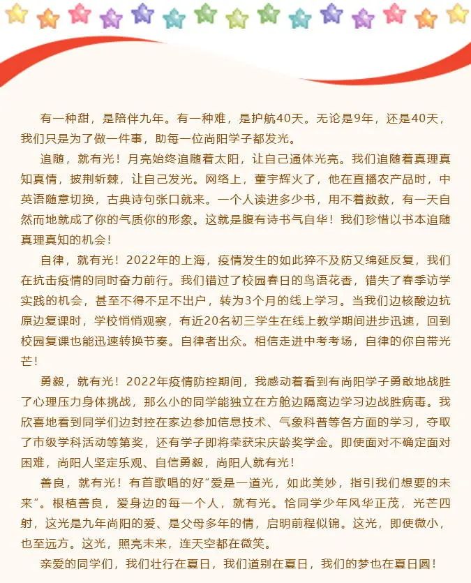 “有一种甜,是陪伴九年。有一种难,是护航40天。无论是9年,还是40天,我们只是为了做一件事,助每一位尚阳学子都发光。尚阳学子,今日出征。不负韶华,为梦而战。中考,加油!”尚阳外国语学校为初三学子送上了一封饱含深情的信,寄语学子们“追随着真理,披荆斩棘,让自己发光。”“坚持自律,奋力前行,自带自信光芒。”“坚定乐观、自信勇毅,战胜压力。”“根植善良,以父母、老师、学校多年的关爱,照亮似锦前程。”九年级组全体教师身着红色服装合影“点赞”,为学子送上鼓励,祝愿他们赢得可期的未来。