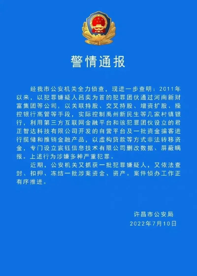 4、许昌警方通报村镇银行案进展,又抓获一批犯罪嫌疑人,查封、扣押、冻结一批落案资金、资产。