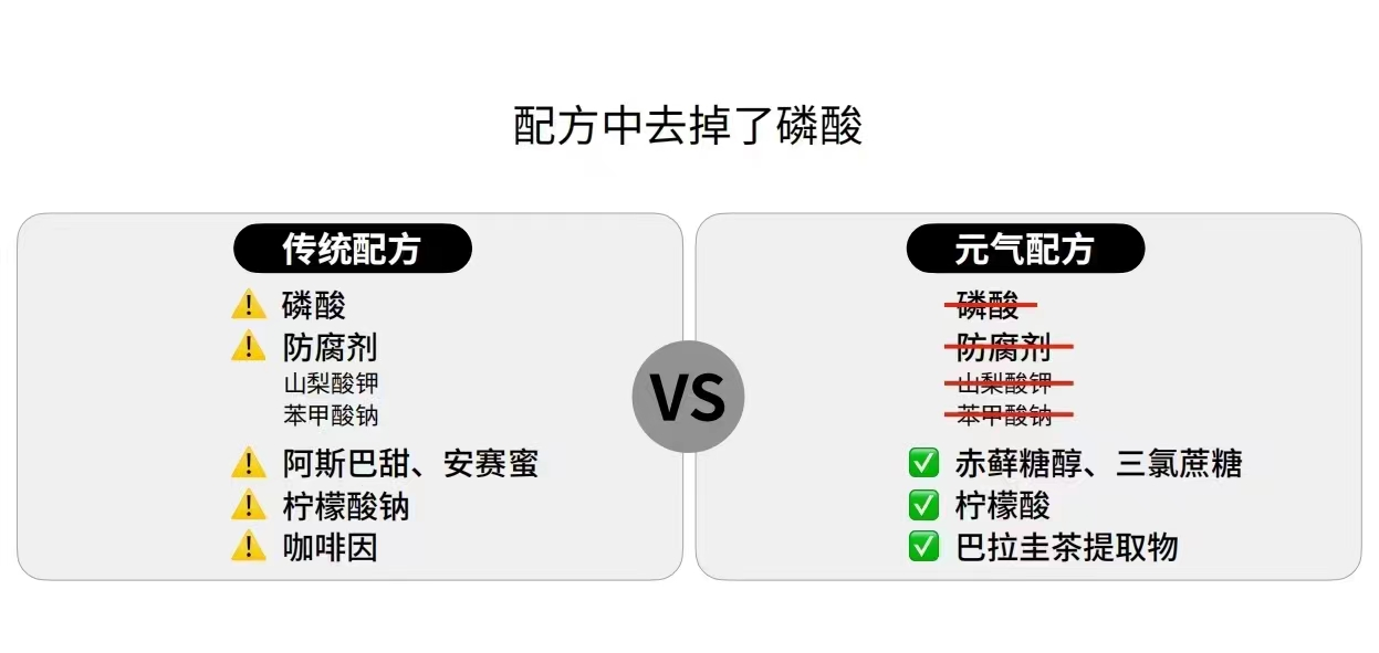 其一,它去掉了传统可乐配方的磷酸。有研究表明,过量摄入磷酸盐对人体骨骼和心脑血管都有一定危害——但磷酸有增益饮料口味的功效,去掉它也意味着损失部分口感——正因如此,可模拟磷酸酸感、又不损伤骨骼的配料解决方案,是元气森林新品研发的重点之一。