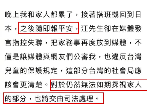 福原爱自曝与家人坐飞机回到日本后报过平安,但江宏杰却在社交平台上发言指控自己失联,将家务事再度放到公众面前,她表示江宏杰的这个行为不仅是让媒体与网友们指责她,也违反了台湾儿童的保护规定,对于自己仍然无法如期探视家人的部分,也将交由司法处理。