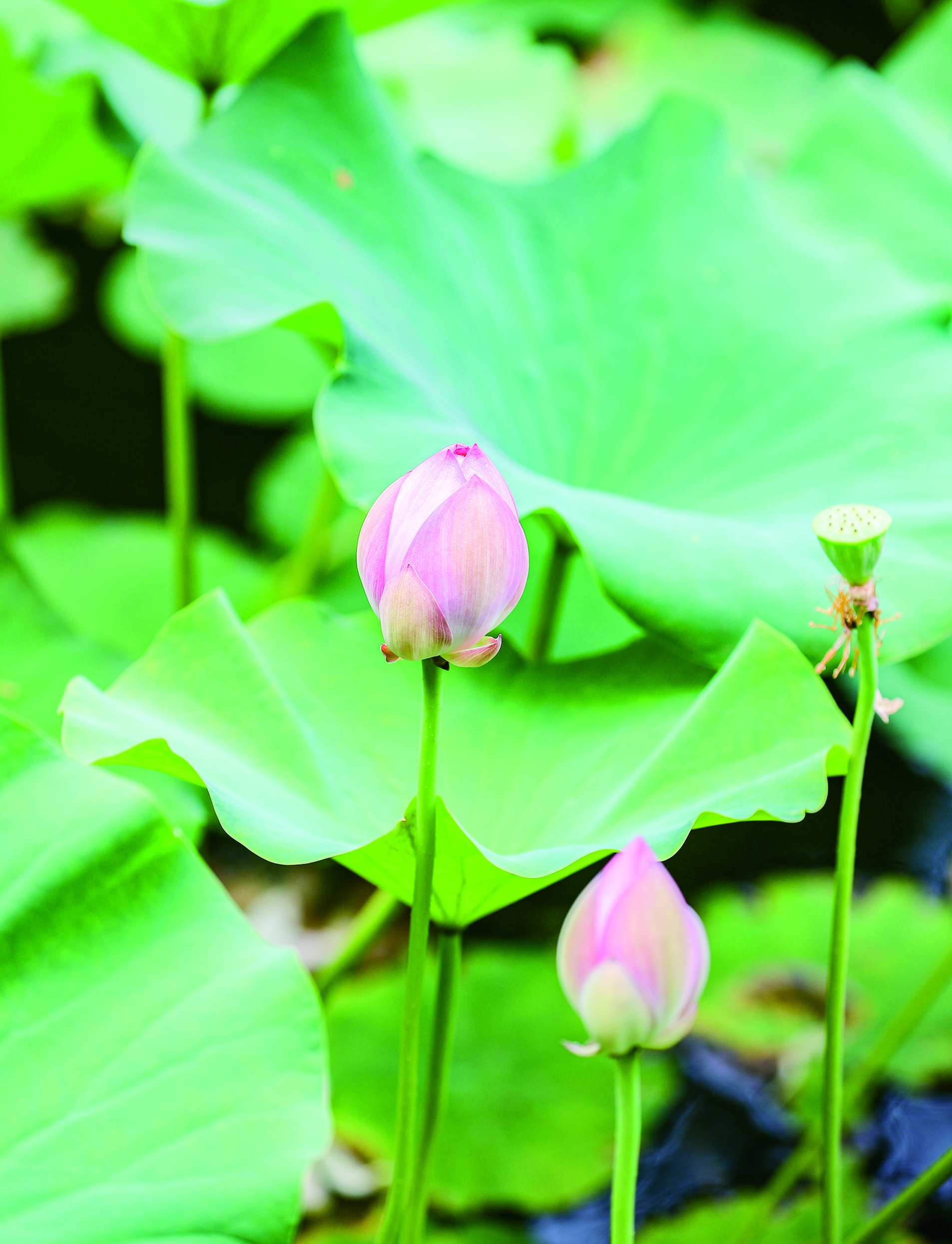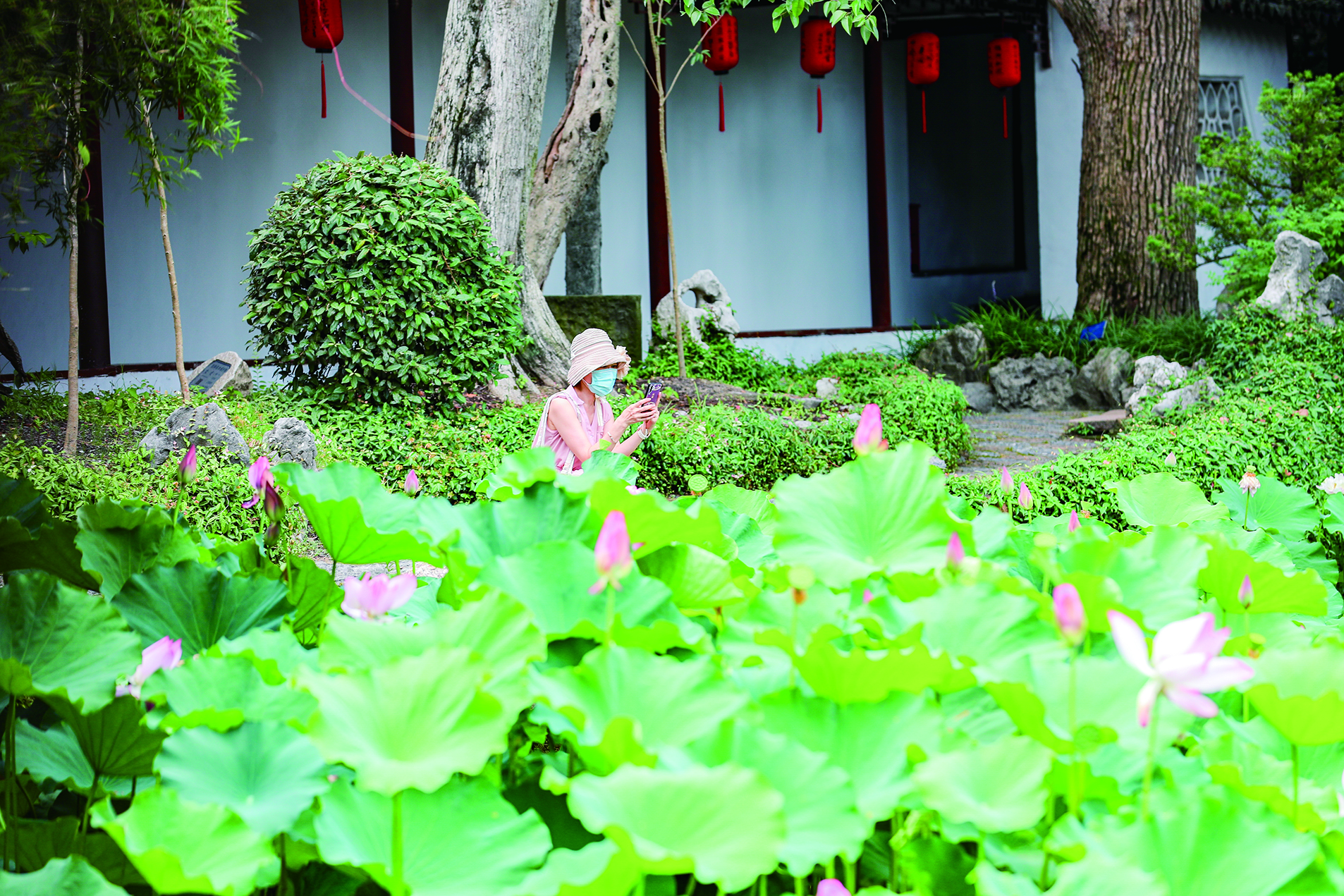 图为市民在园中赏荷度夏。