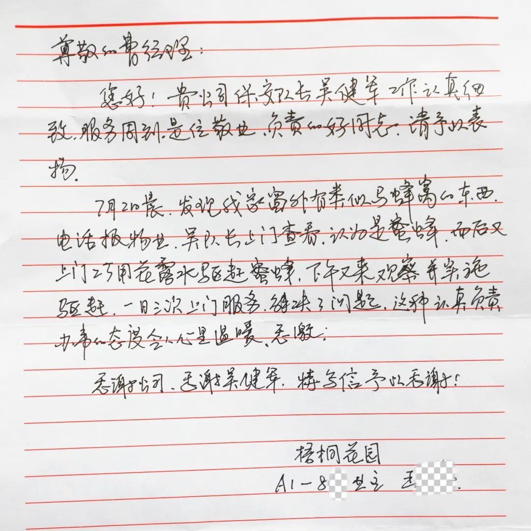 由于蜂群数量较为庞大,吴建军一日三次上门处理,终于彻底消除了安全隐患,“抱团扰民”的蜜蜂被“连窝端掉”。两位老人家重获平安相当欢喜,王阿姨更是亲笔手书一封感谢信,倾诉全家人的感激之情,以及对金地物业精品服务的认可。