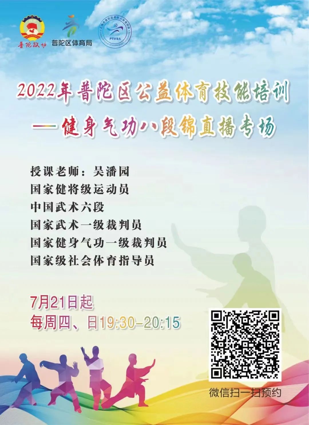由普陀区政协、普陀区体育局、普陀区老年人体育协会联合主办的2022年普陀区公益体育技能培训——健身气功八段锦直播专场,自7月21日起至八月底,每周四、周日19:30-20:15在“上海普陀老体协”微信公众号上进行直播。