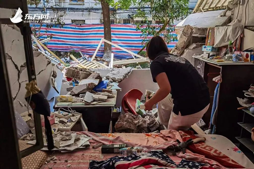 缪小姐一边收拾东西,一边看着破损的房子说,家没了,所幸人没事
