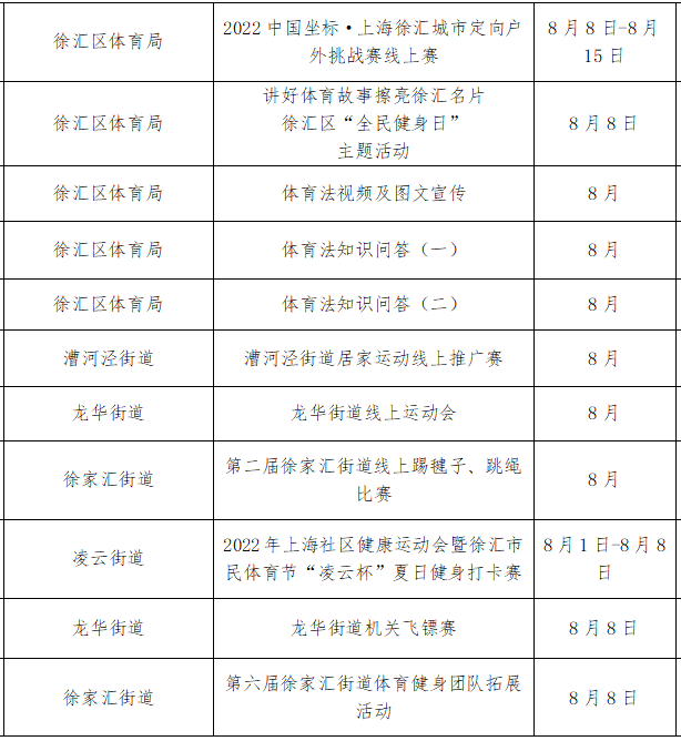 此次“全民健身日”主题活动总计有241项赛事活动,其中市级比赛为28项,区级及以下比赛数量共达到211项。徐汇区将举办2022中国坐标·上海徐汇城市定向户外挑战赛线上赛、徐汇区“全民健身日”主题活动、《体育法》知识问答,还有漕河泾街道居家运动线上推广赛、第二届徐家汇街道线上踢毽子跳绳比赛、龙华街道机关飞镖赛等11项内容。