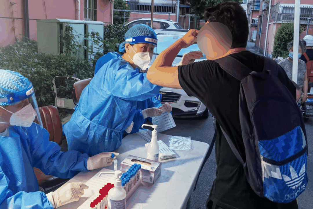 ▲泗塘中学副校长在核酸检测采样点担任扫码工作