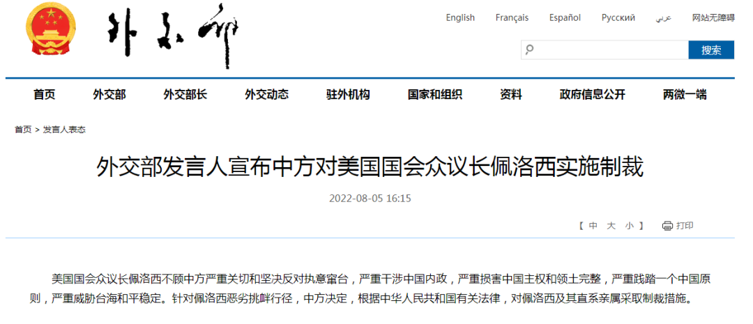 针对佩洛西恶劣挑衅行径,中方决定,根据中华人民共和国有关法律,对佩洛西及其直系亲属采取制裁措施