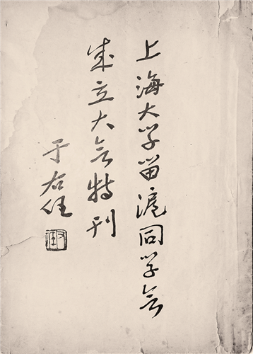 1936年9月上海大学留沪同学会成立。图为《上海大学留沪同学会成立大会特刊》封面于右任题刊名