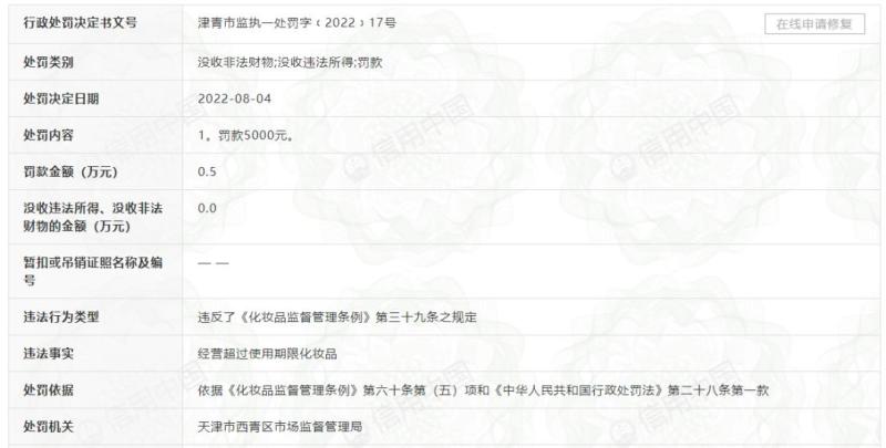 据信用中国网站消息,近日,天津屈臣氏个人用品商店有限公司第六十七分店因经营超过使用期限的化妆品,违反《化妆品监督管理条例》,被天津市西青区市场监督管理局罚款5000元。