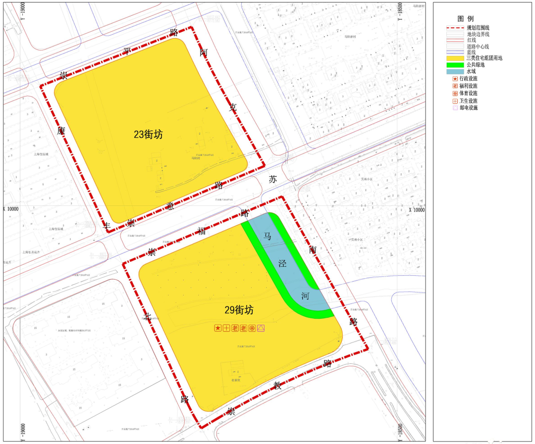 本次规划调整涉及马陆南社区JDC1-2301单元23、29街坊,23街坊东至阿克苏南路、南至崇意路、西至康丰北路、北至崇平路;29街坊东至阿克苏南路、南至崇教路、西至康丰北路、北至崇福路。