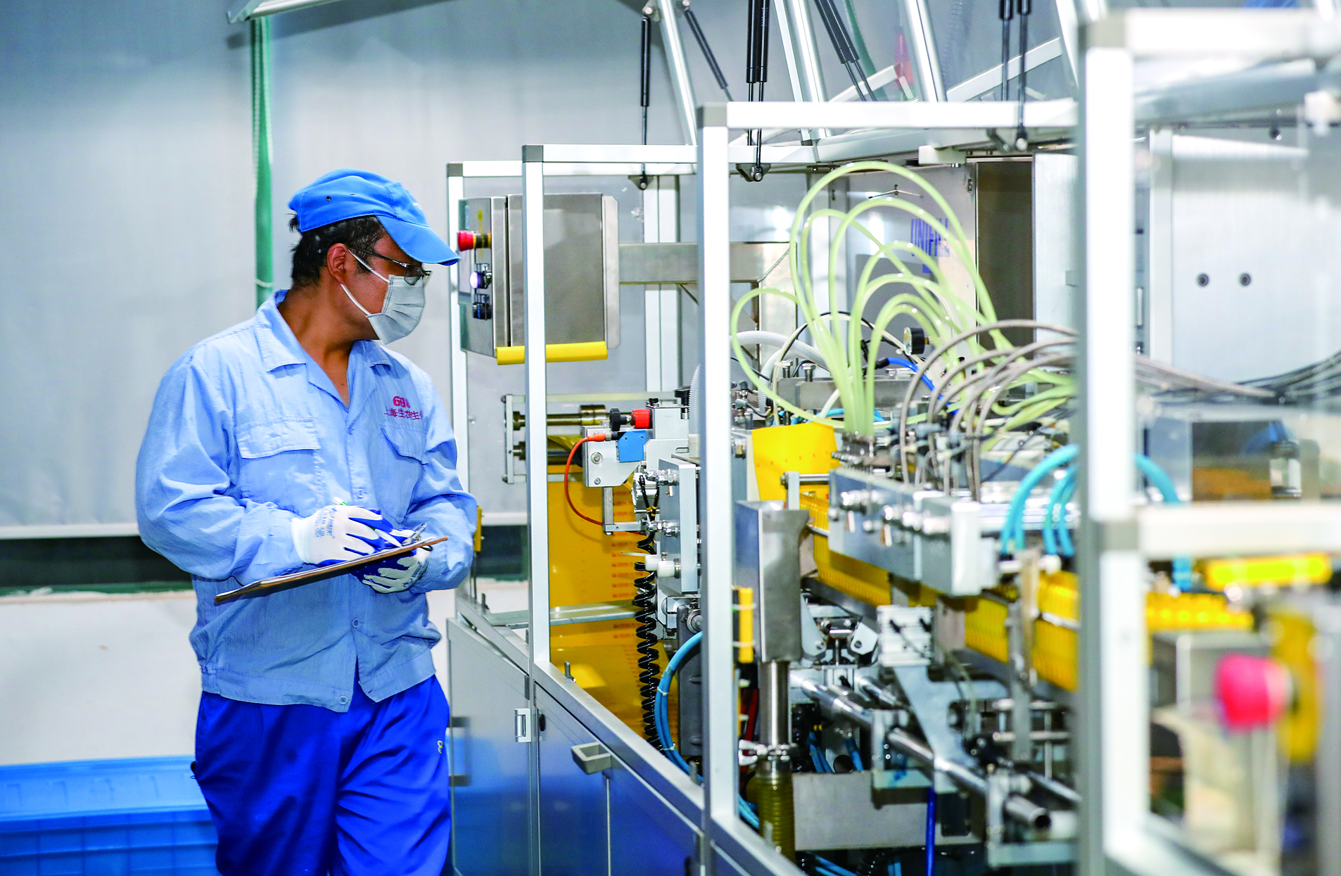 图为公司针管剂自动线生产车间内,技术人员正在调试品管实验室新设备。