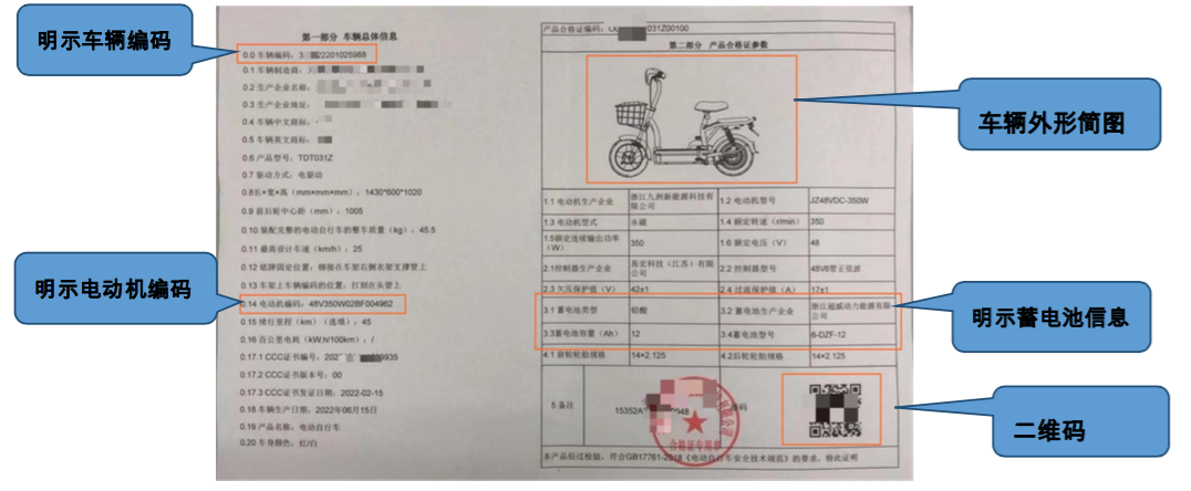 选购电动自行车时要仔细查看产品合格证上的信息,注意查看整车的车辆编码、电动机编码、蓄电池、车辆外形等是否与企业明示的信息相同。正规产品在产品合格证右下角二维码扫描后可以查看产品在认证机构的备案信息。二维码扫描显示内容应与产品合格证上内容一致。