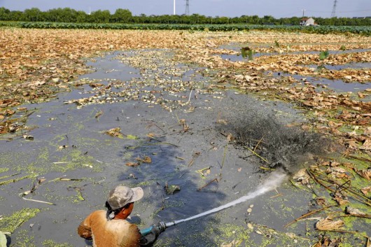 随着时间推移,水塘的温度逐渐上升,不一会李师傅已经满头汗水,胳膊上、腿上也被荷杆划出许多小口。
