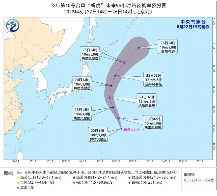 预计,“蝎虎”将以每小时25-30公里的速度向北偏西方向移动,24日转向东北方向移动,强度变化不大,并于26日变性为温带气旋。未来“蝎虎”对我国无影响。