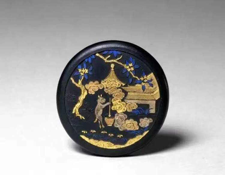 汪斗山款麝香月墨,一面为月宫桂花树下玉兔捣药图,一面为麝香月填金隶书三字,属于休宁派传统制墨产品中高级礼品墨、药品墨的混合。