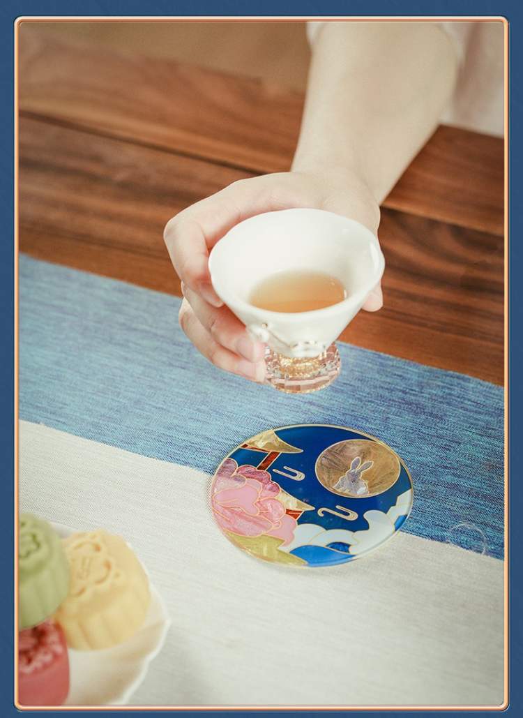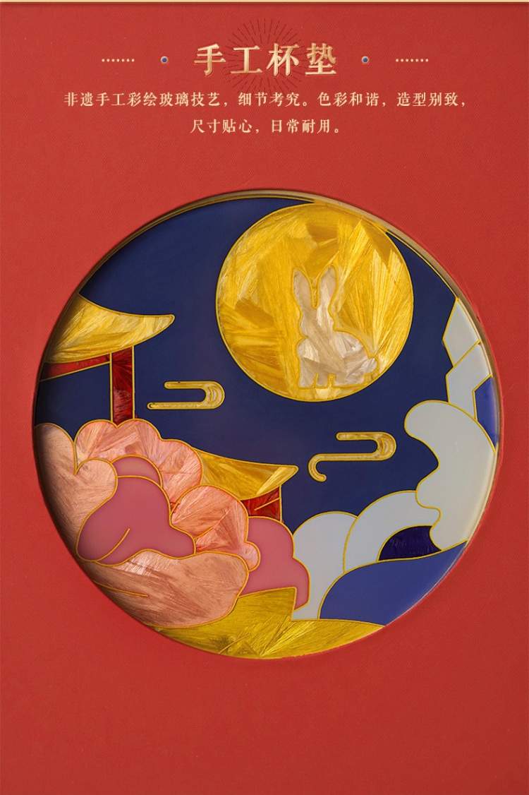 外盒上镶嵌的手工彩绘玻璃杯垫,像一轮金黄色的圆月,十分醒目而点题,兼顾了实用性和观赏性。