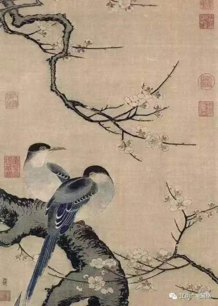 南宋沈子蕃《缂丝梅鹊图轴》,体现了画稿疏朗古朴的意趣,画面生动、清丽、典雅,是沈子蕃为数不多的存世作品之一,也是南宋时期缂丝工艺杰出的代表作。