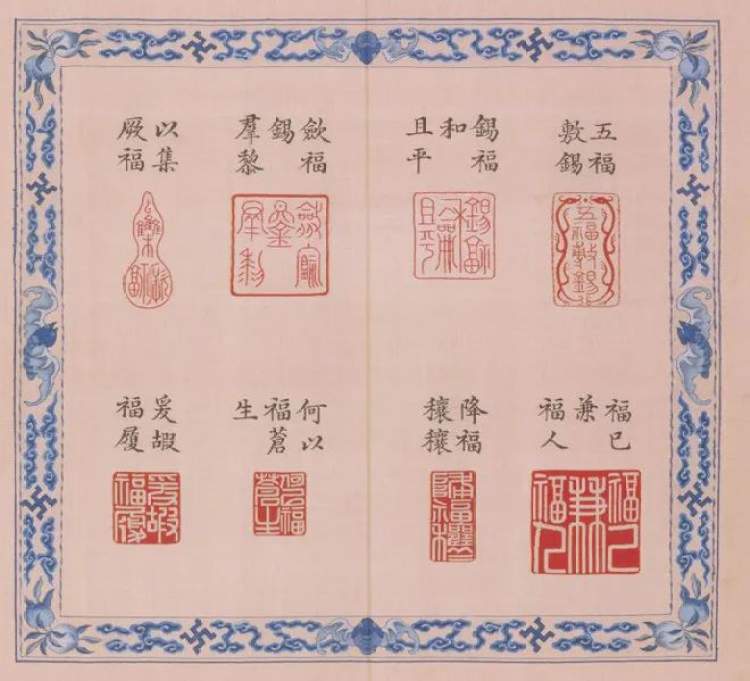 月饼的表皮上方,都印着福字元素,它们都来自北京故宫博物院所藏的《缂丝宝典福书册》。这套书册涵义也十分祥和,1790年乾隆皇帝八十寿辰,大臣们纷纷进献宝物,其中一套青田石雕印章得到了乾隆的青睐。这一套60枚印章的内容来自大臣们赞颂乾隆皇帝的大量诗文,选用了其中带有福寿字样的句子镌刻而成,命名为《宝典福书》。