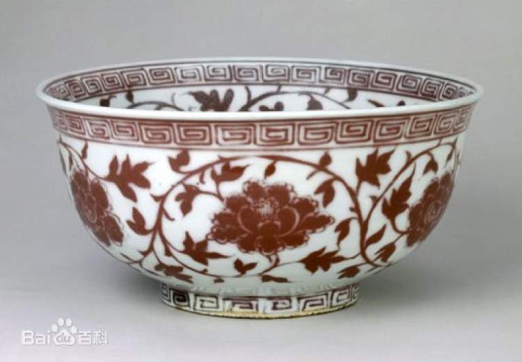 明代釉里红缠枝牡丹纹碗,造型和纹饰构图都具有鲜明的时代风格,为洪武釉里红瓷器的代表作品。