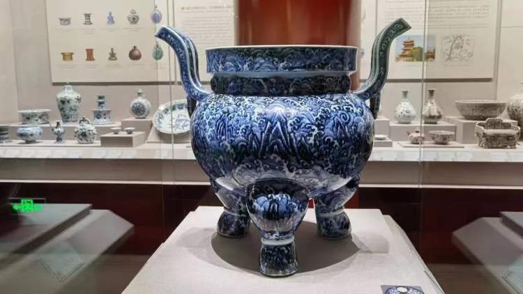 明永乐青花海水纹香炉,内施白釉,外壁通体绘海水江崖纹,形体硕大,青花色泽浓艳,晕散明显。