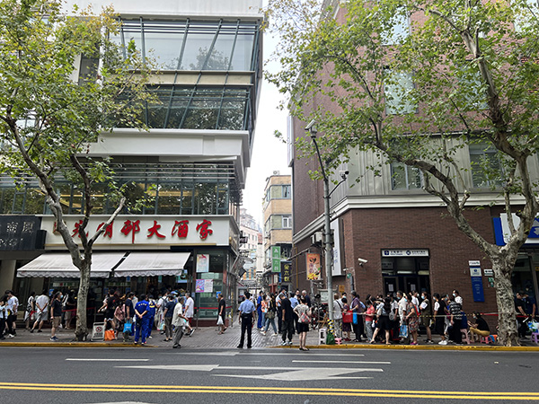 8月26日下午,上海老字号光明邨大酒家门口排起了百米长队。