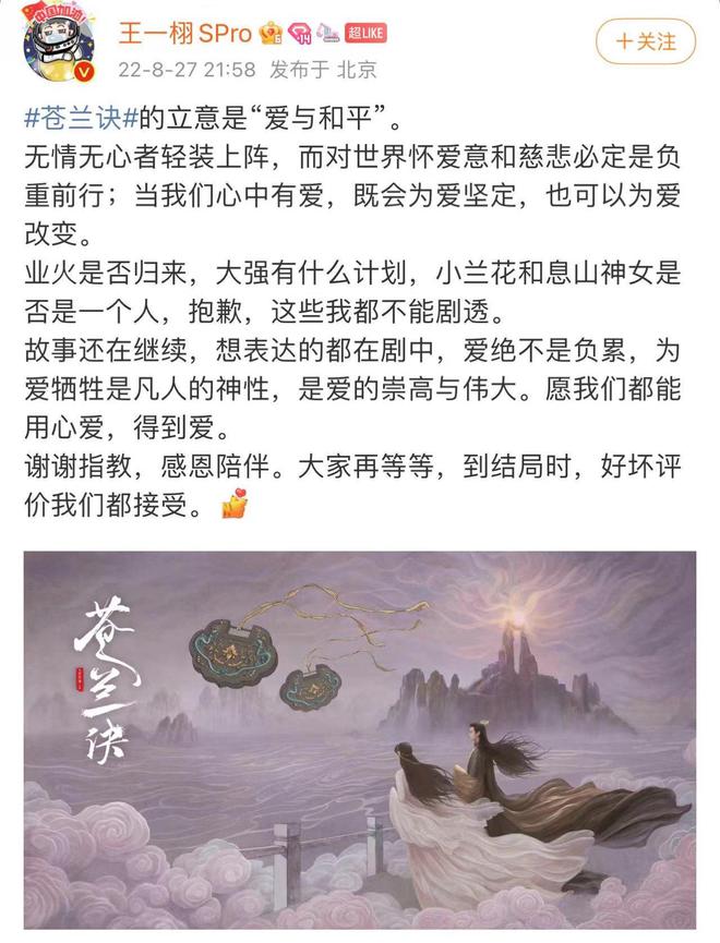 27日晚,王一栩发文回应《苍兰诀》剧情争议,他表示《苍兰诀》的立意是“爱与和平”,称想表达的都在剧中,爱绝不是负累,“希望大家再等等,到结局时,好坏评价我们都接受。”